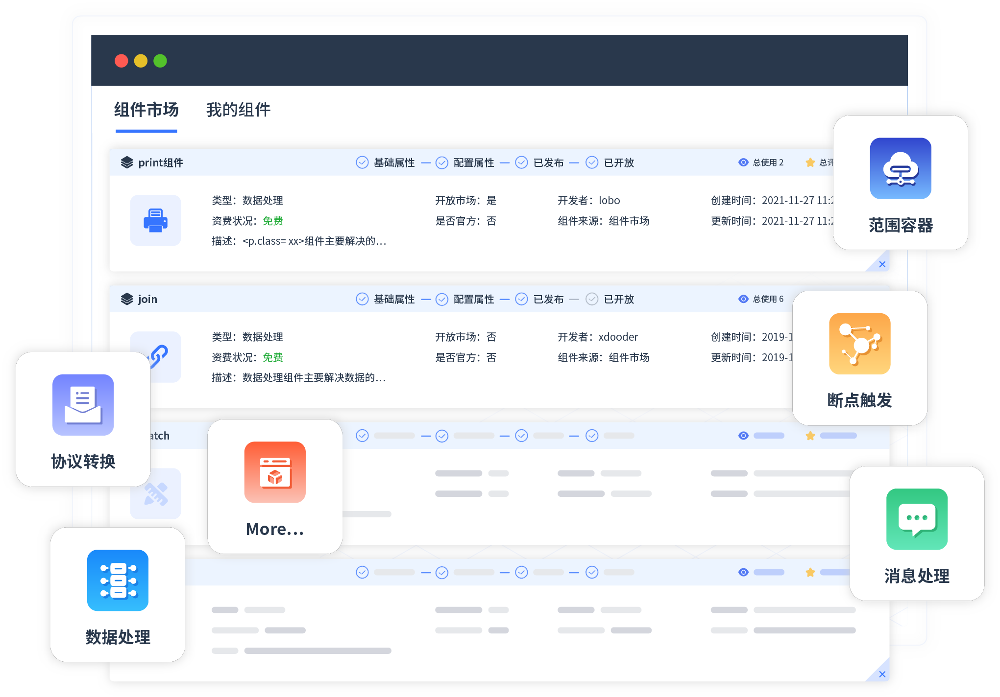 针对集成场景,焦点娱乐提供组件市场,例如协议转换、消息处理、文件操作等。除平台提供的组件外,客户可以自定义所需组件。